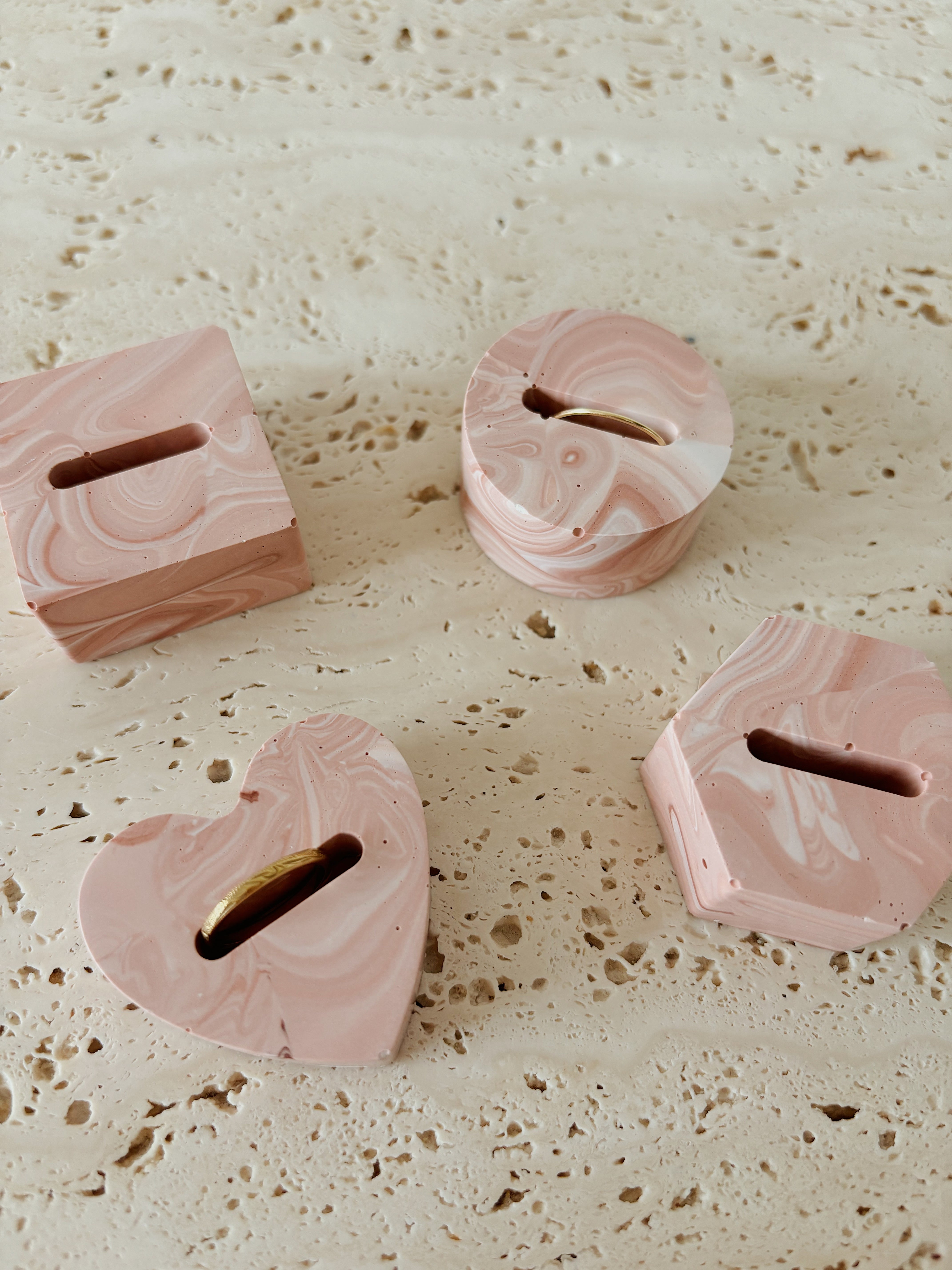 ハート、ラウンド、スクエア、ヘキサゴン型のリングスタンド、ダブルタイプ。